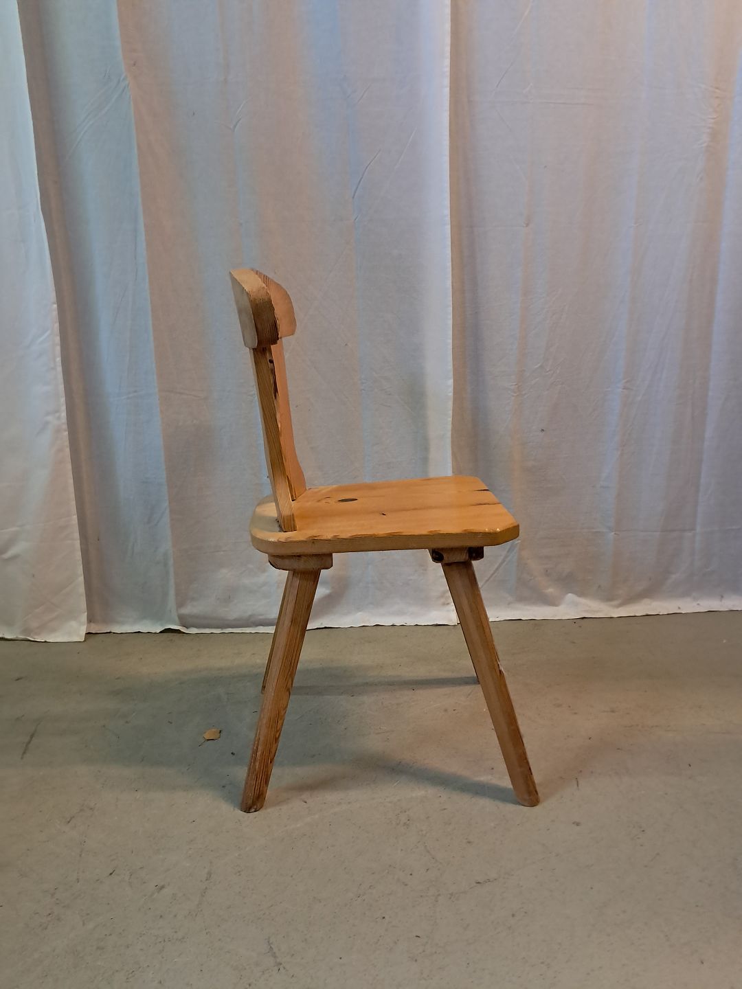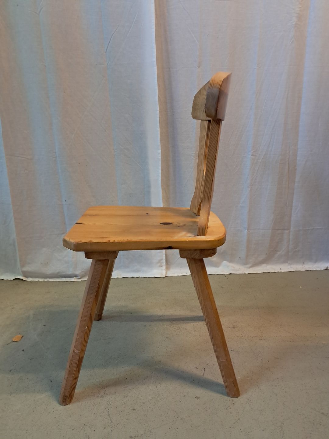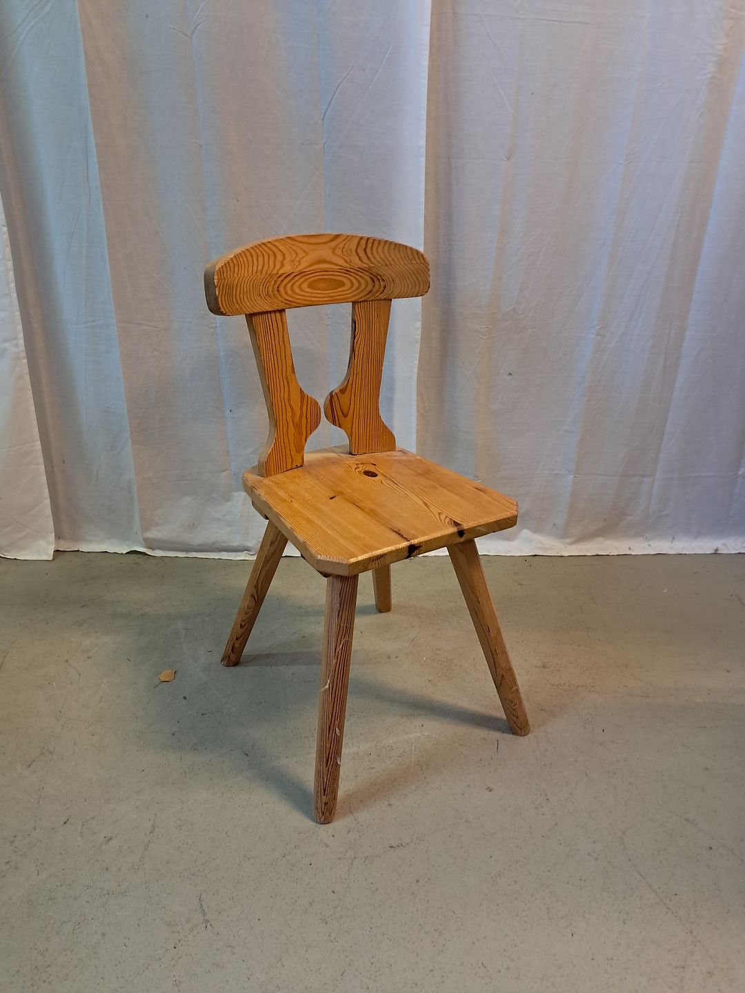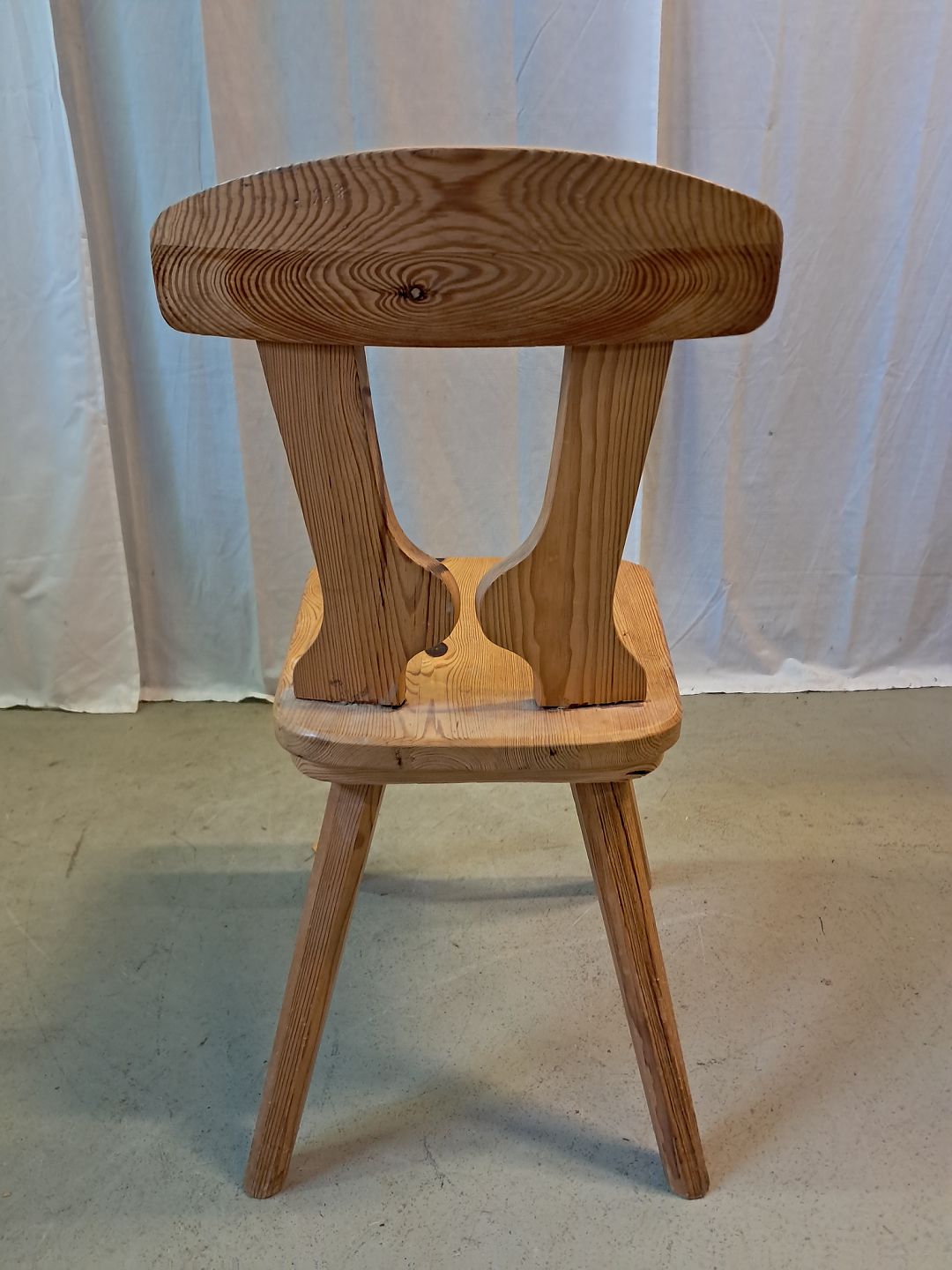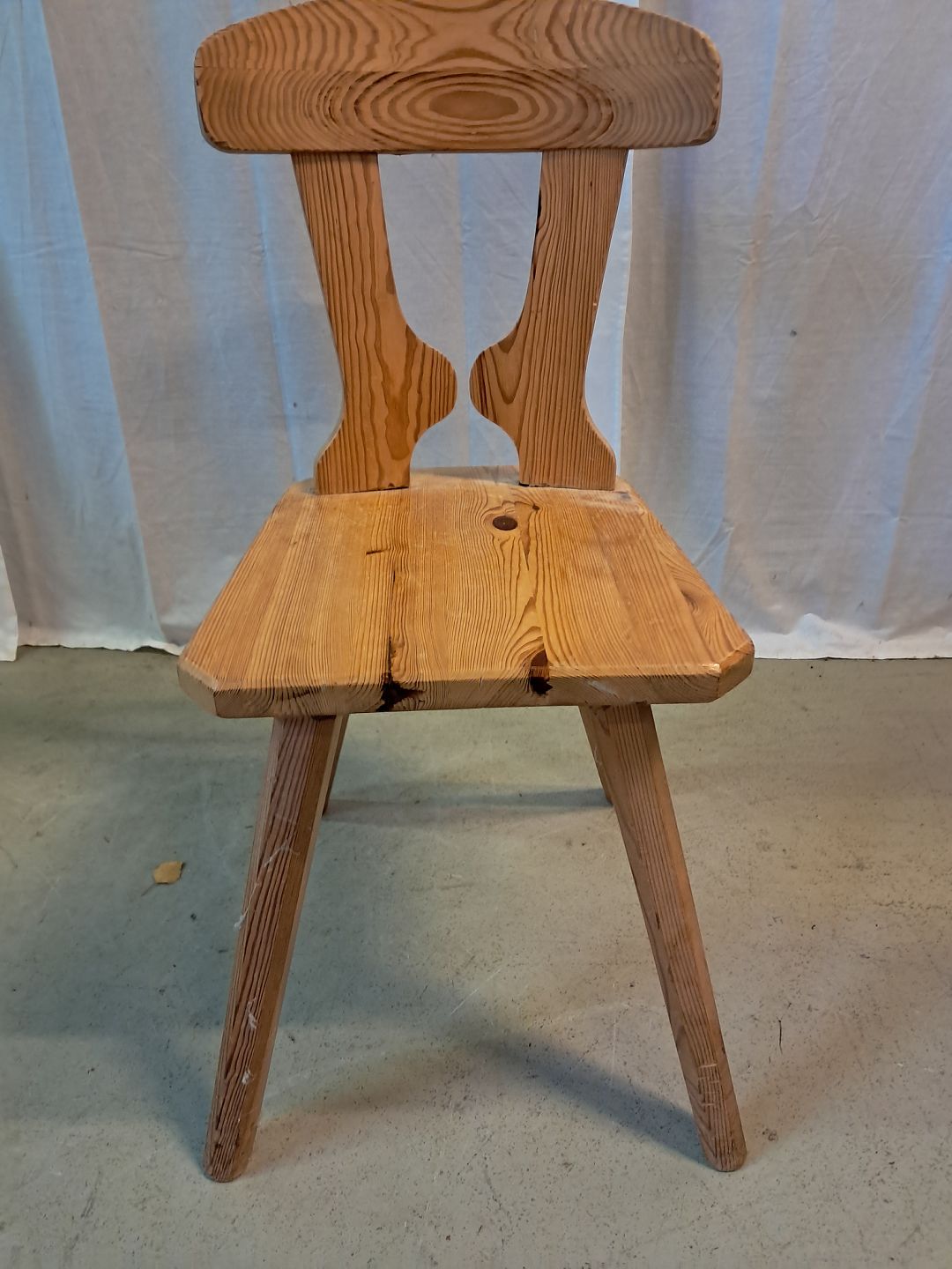 Stol i massivt fyrretræ, fra 1980erne. Den har brugsspor. Ryghøjde 83cm Sædehøjde 45cm Emne nummer: 77381