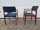 2 Armstole i massivt teaktræ, fra 1960erne. De har brugsspor og defekt betræk. Ryghøjde 78cm Sædehøjde 44cm Emne nummer: 77387