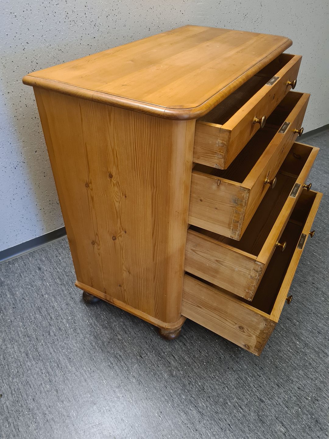 Kommode fra 1940'erne I massiv fyrretræ. Den har brugsspor og lugter lidt af røg. Højde 88 cm. Bredde 94 cm. Dybde 46 cm. Emne nummer: 93000
