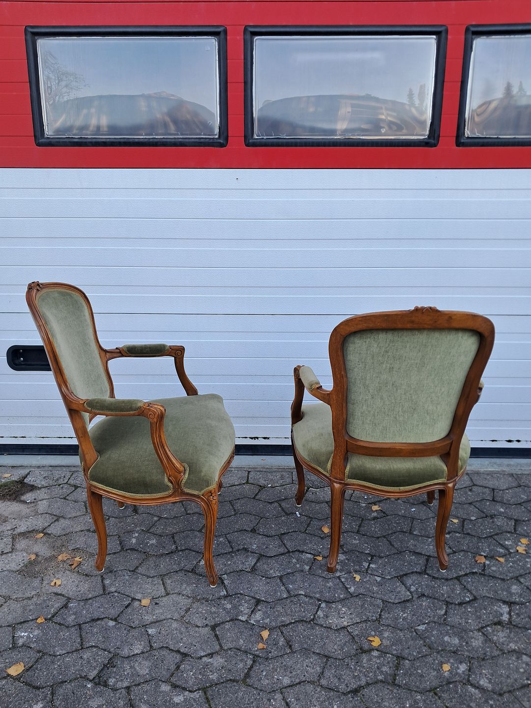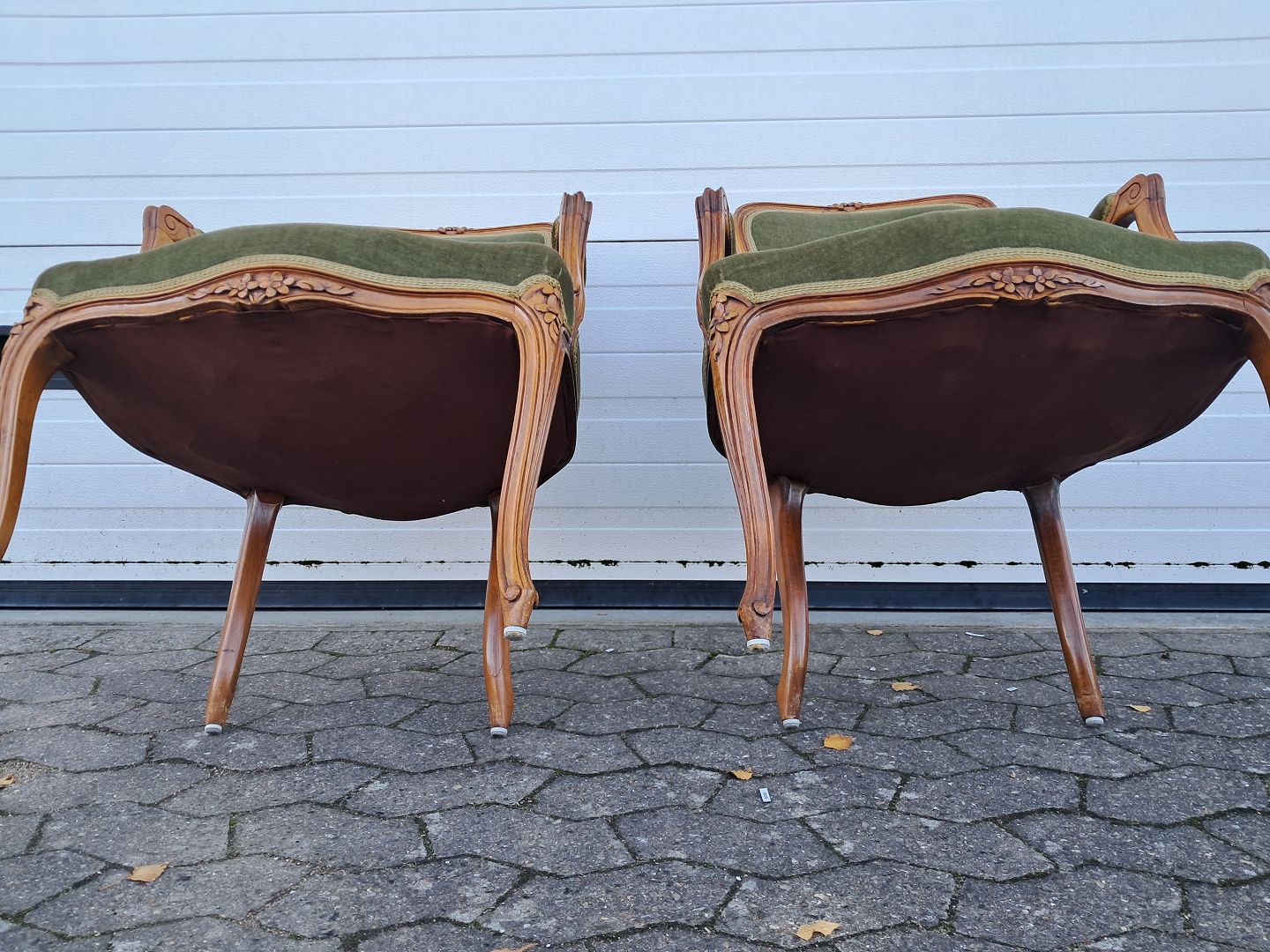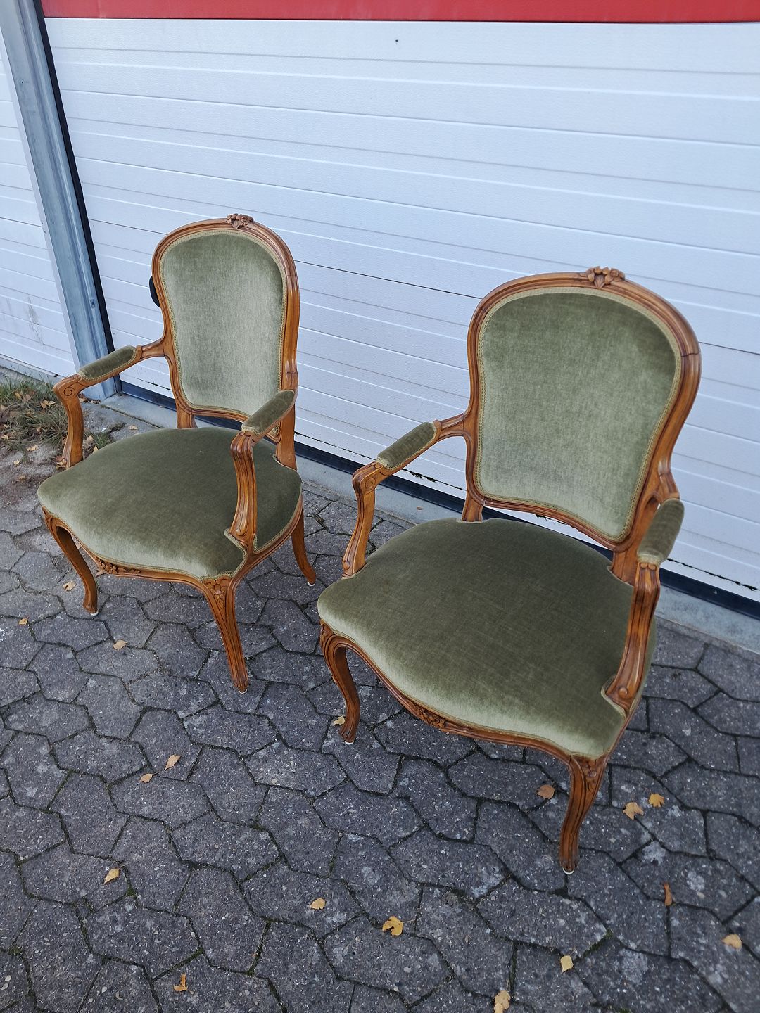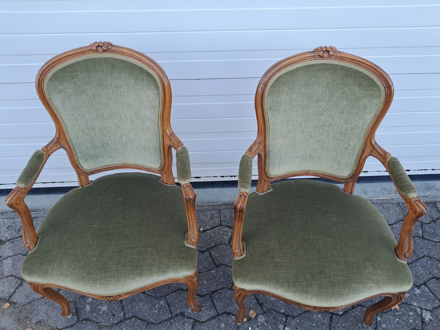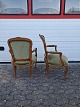 2 Rokokostole i massivt bøgetræ med velourbetræk, fra 1980erne. De har brugsspor. Ryghøjde 93cm Sædehøjde 44cm Emne nummer: 77439