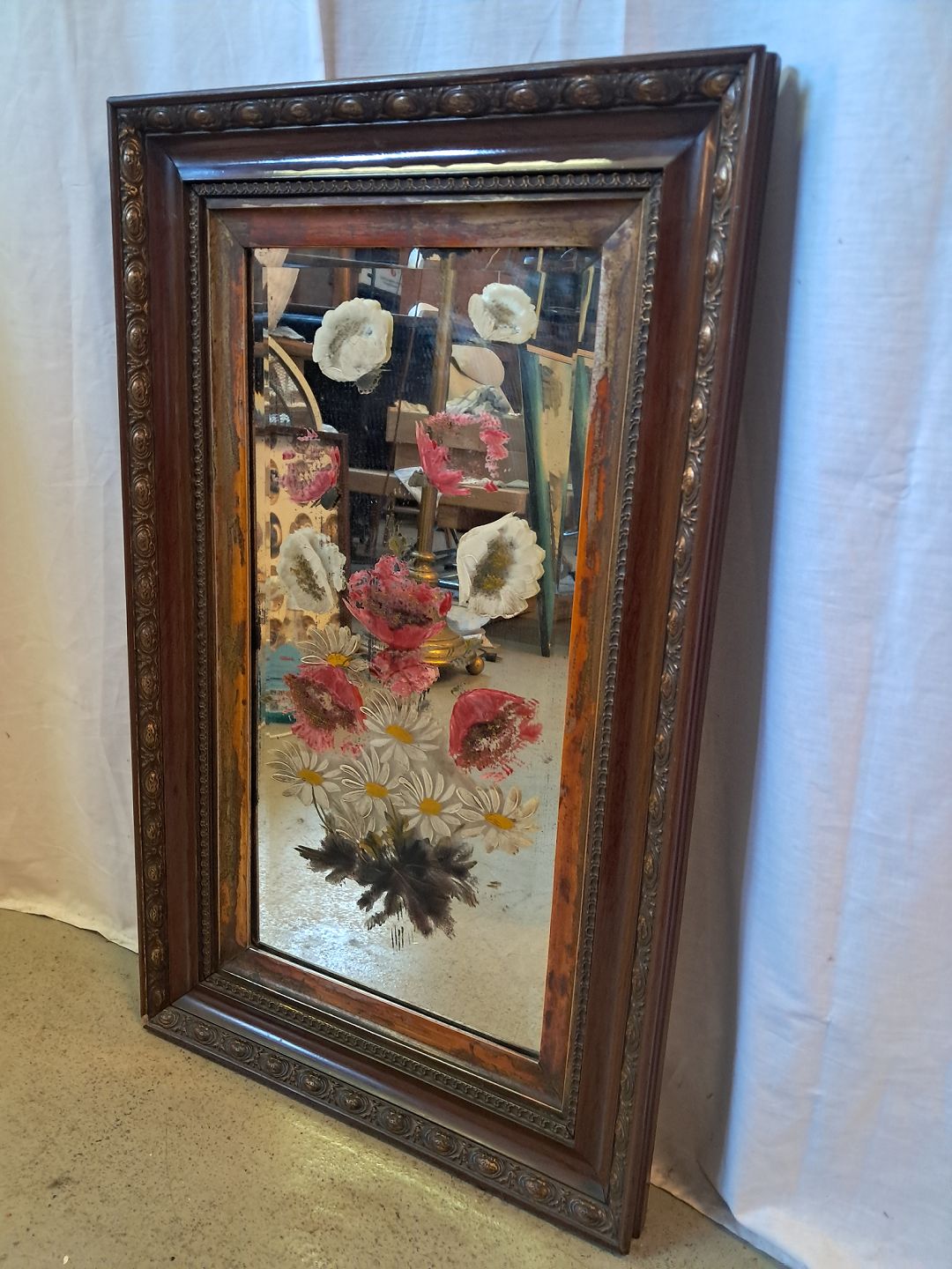 Spejl med påmalet blomster, fra 1920erne. Det har brugsspor. Højde 79cm Bredde 48cm Emne nummer: 77490