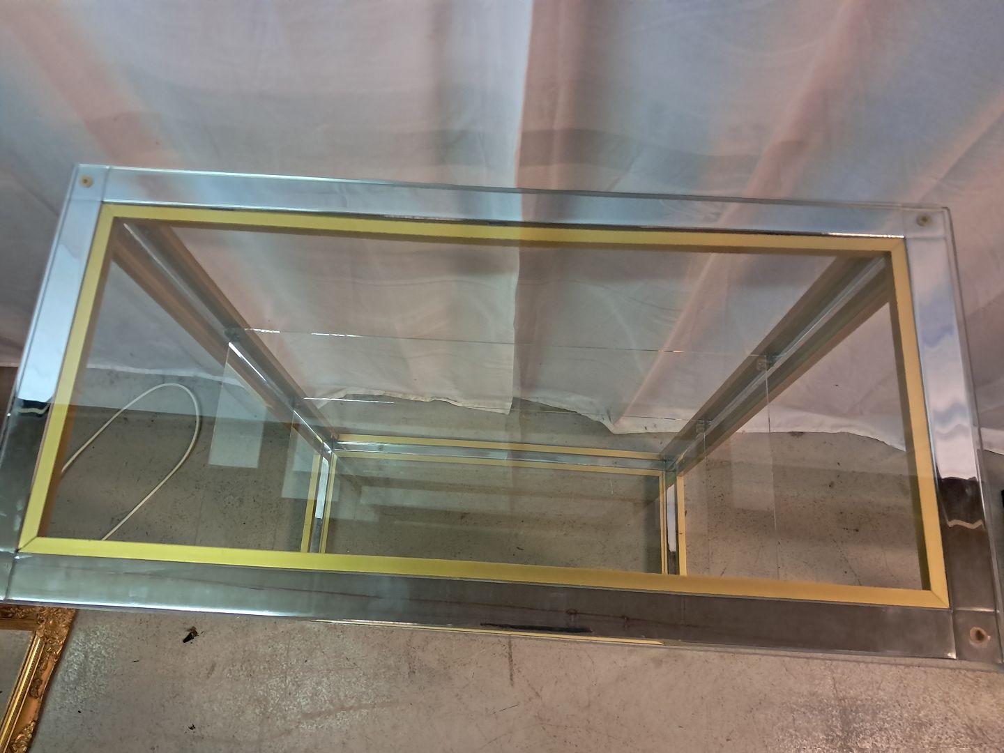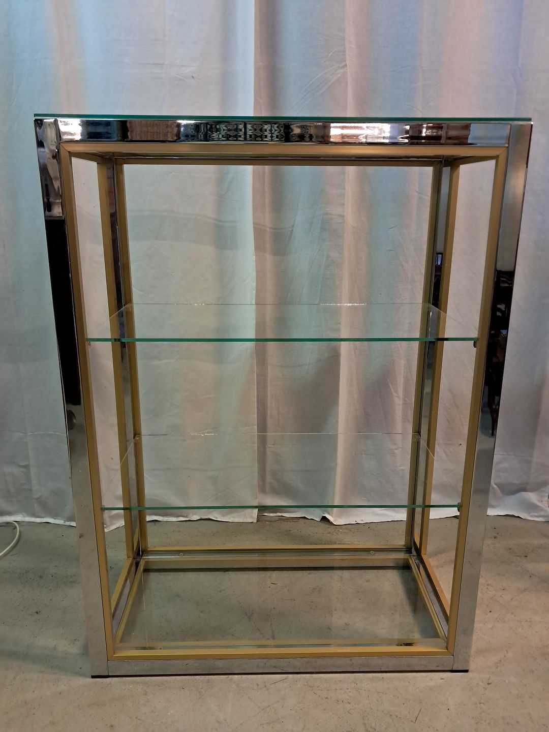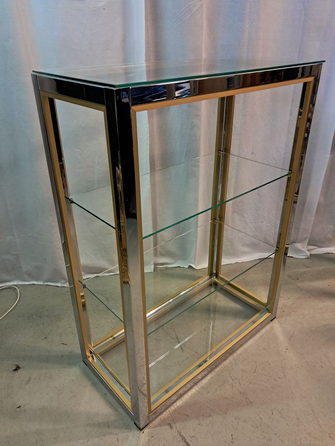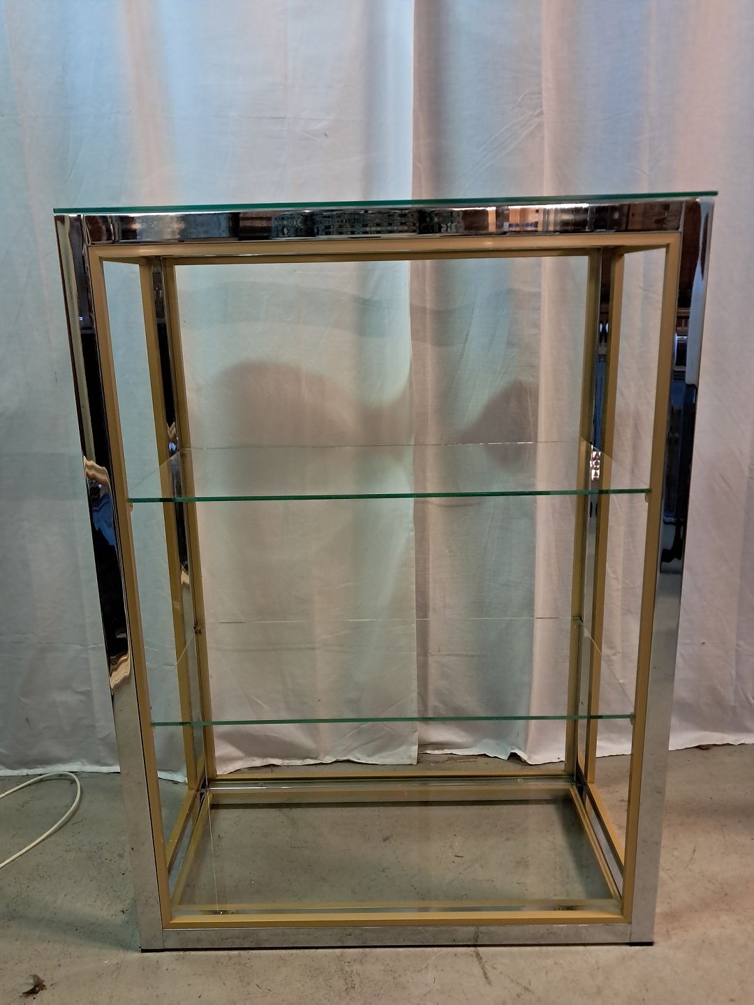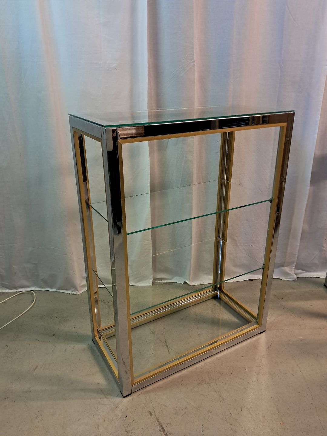 Forkromet reol i metal med glashylder, fra 1980erne.