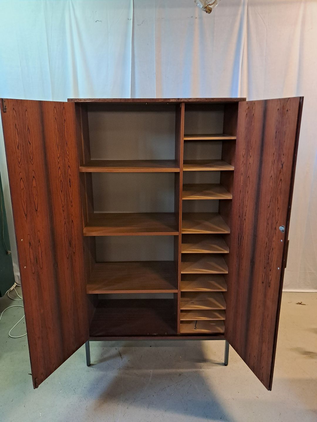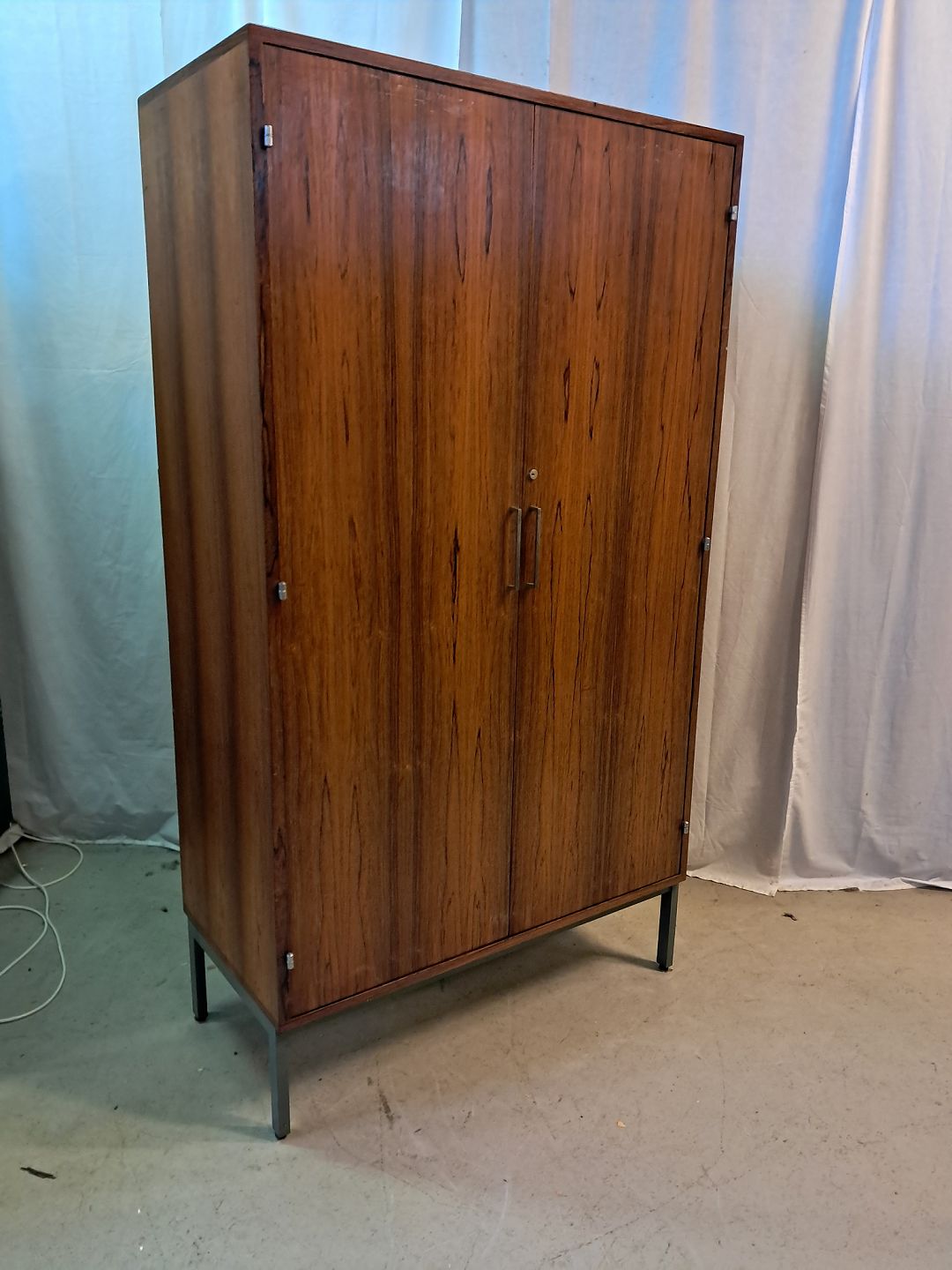 Skab i fineret palisander, fra 1960erne. Det har brugsspor og der medfølger ikke nøgle. Højde 166cm Bredde 92cm Dybde 45cm Emne nummer: 77595