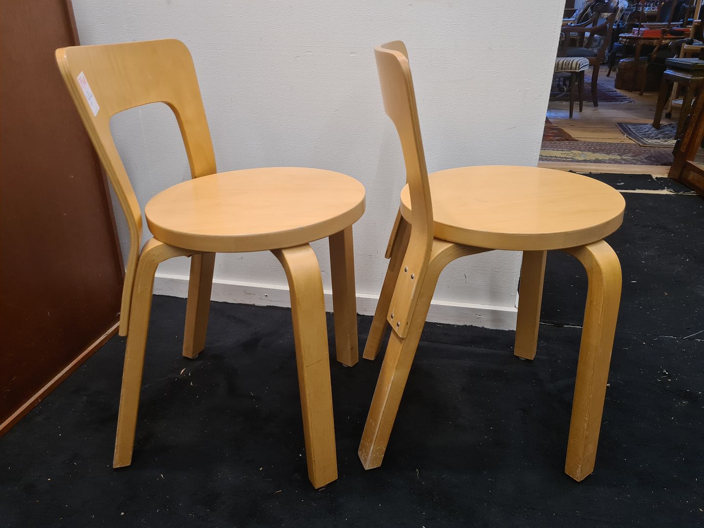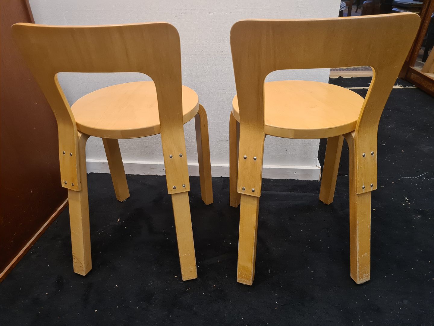 Par Alvar Aalto stole model 65 i bøg. Fremstår pæne og stabile uden de store brugsspor. Højde 66 cm. Bredde 35 cm. Dybde 38 cm. Sædehøjde 45 cm. Emne nummer: 80914