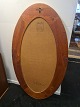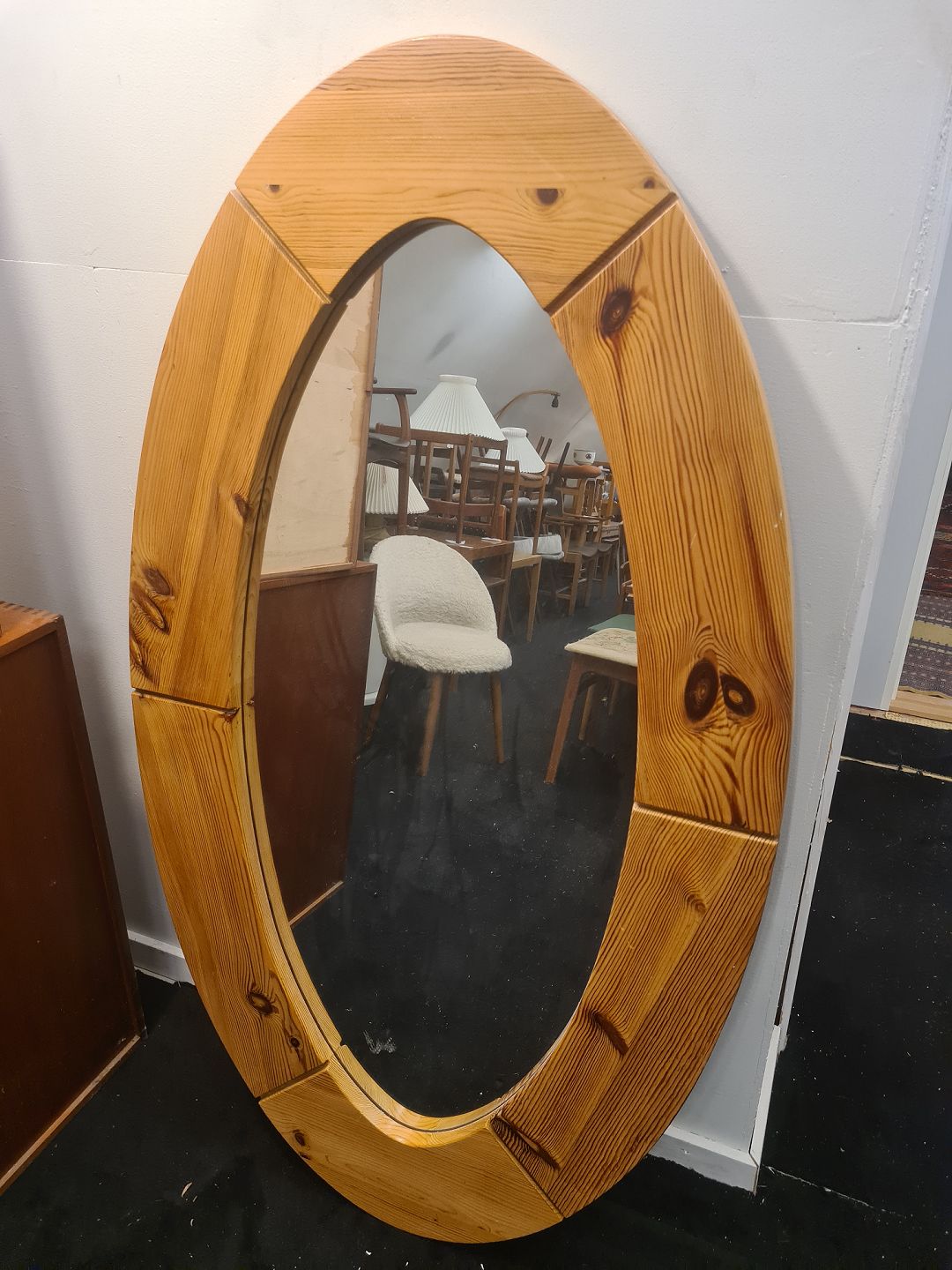Svensk designet ovalt spejl i massiv fyr. Fremstillet i 1980'erne. Fremstår pænt og velholdt uden nævneværdige brugsspor. Højde 140 cm. Bredde 80 cm. Dybde 4 cm. Emne nummer: 80917