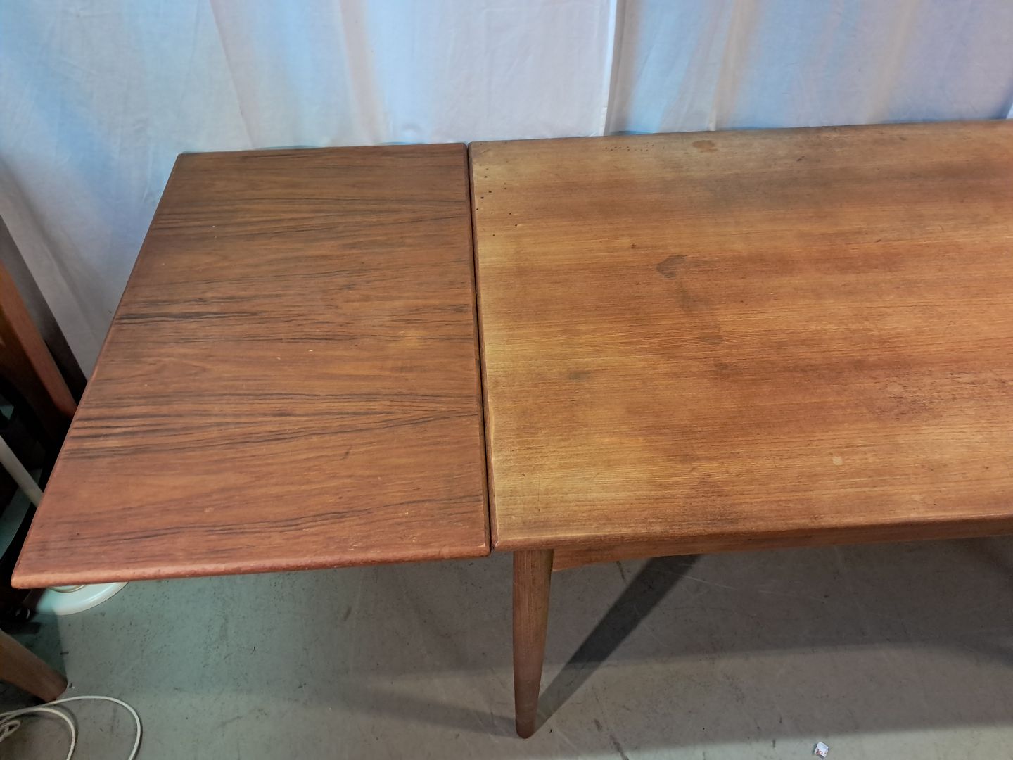 Spisebord i fineret teaktræ med hollandsk udtræk, fra 1960erne. Det har brugsspor og finer defekt. Højde 74cm Bredde 90cm Længde 130cm Længde med udtræk 240cm Emne nummer: 77677