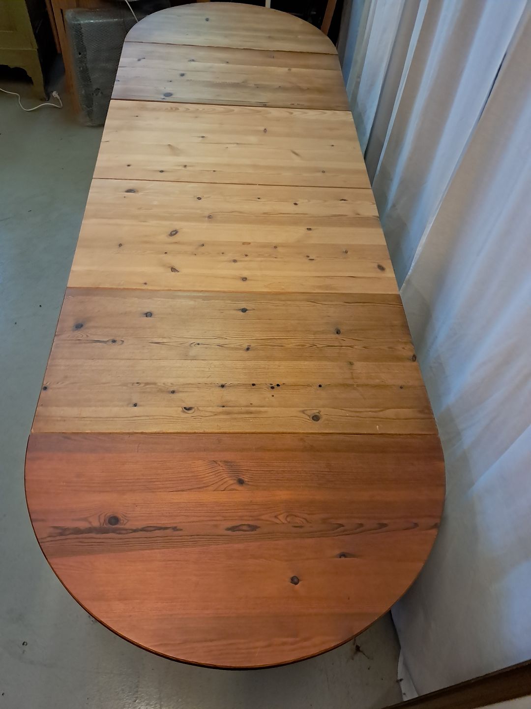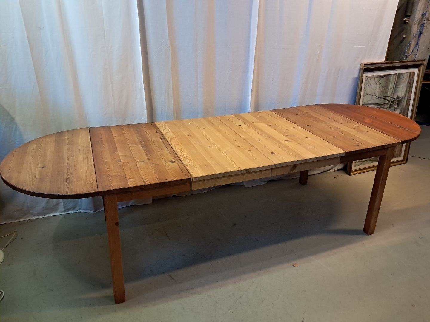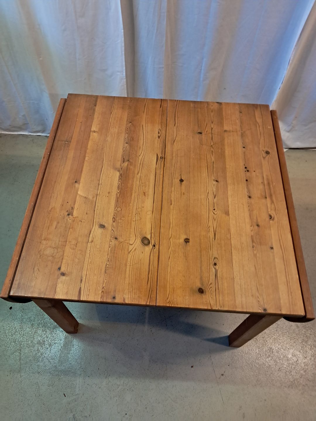 Spisebord i massivt fyrretræ med klapper og 2 tillægsplader, fra 1980erne. Det har brugsspor og trænger til slibning og sæbevand. Højde 72cm Bredde 88cm Længde 87cm Længde med klapper og tillægsplader 268cm Emne nummer: 77699
