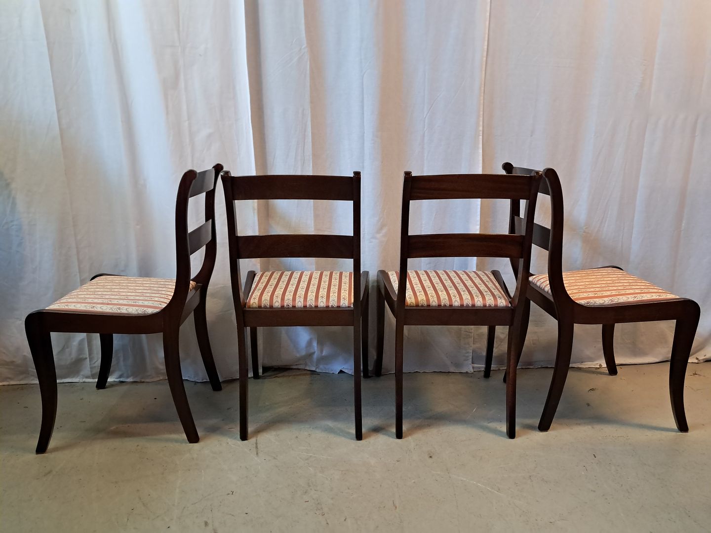 4 Stole i massivt mahogni og bøgetræ, fra 1980erne. De har brugsspor. Ryghøjde 84cm Sædehøjde 44cm Emne nummer: 77715