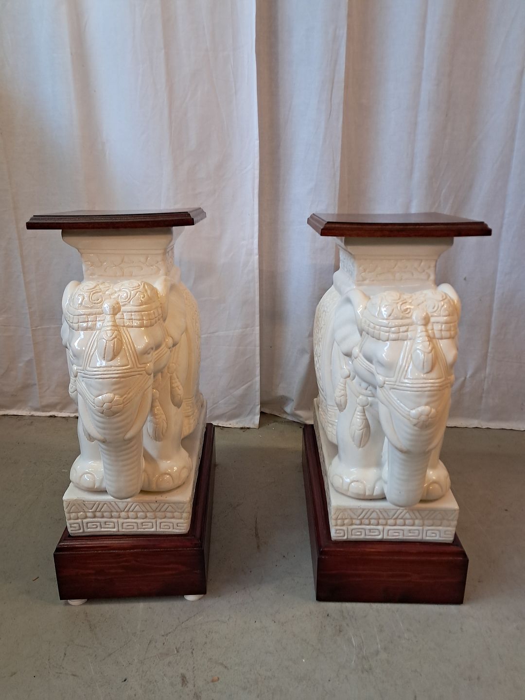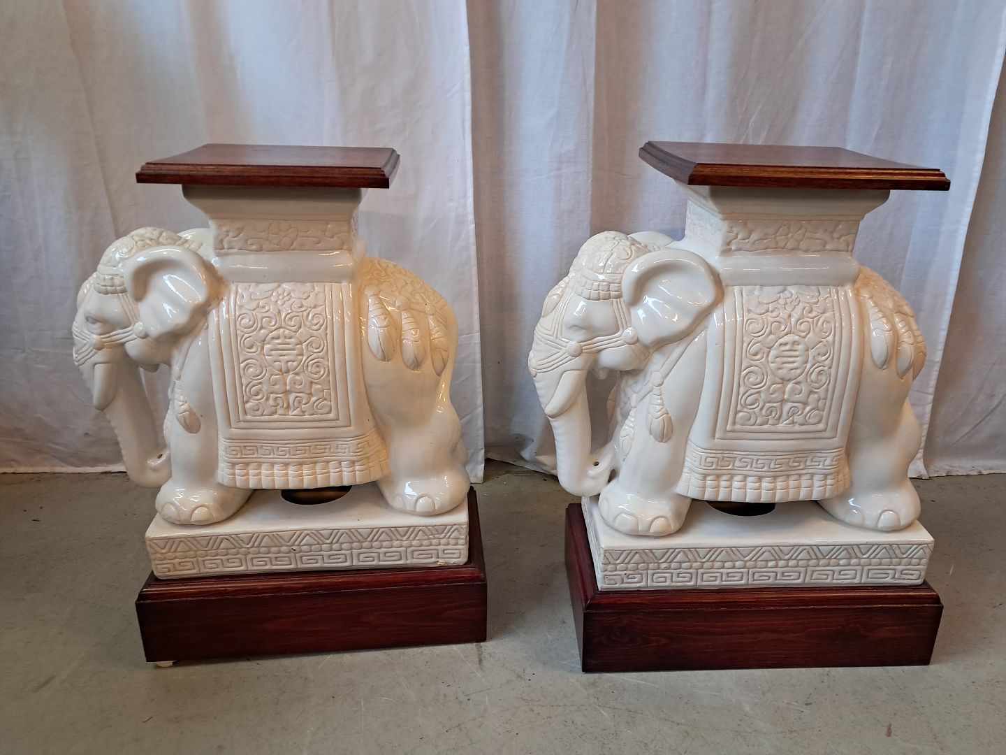 2 Pocelæns-elefanter med træsokkel og topplade, fra 2000erne. Højde 66cm Bredde 26cm Længde 47cm Emne nummer: 77721