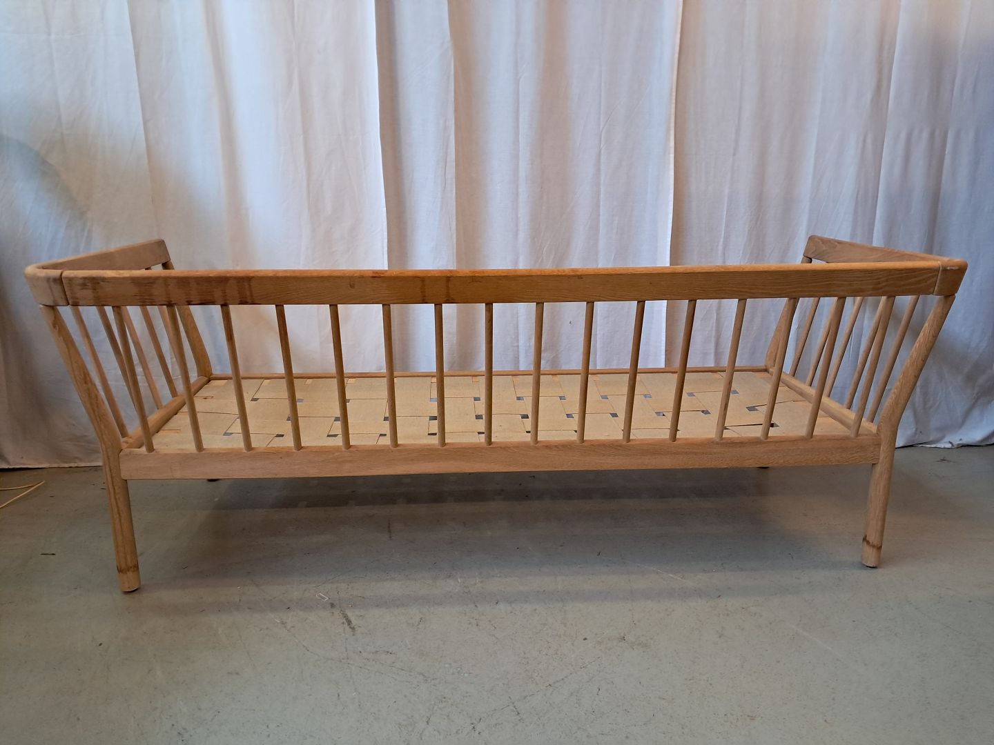 Sofa i massivt egetræ med hynder af kunst-rugskind, fra 2000erne. Den har brugsspor. Ryghøjde 76cm Sædehøjde 45cm Bredde 190cm Dybde 76cm Emne nummer: 77723