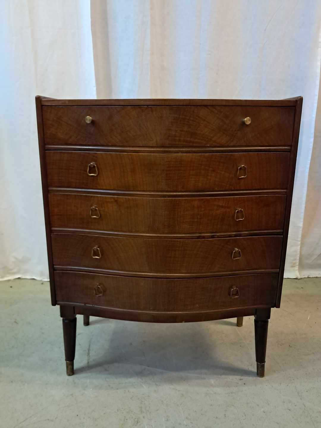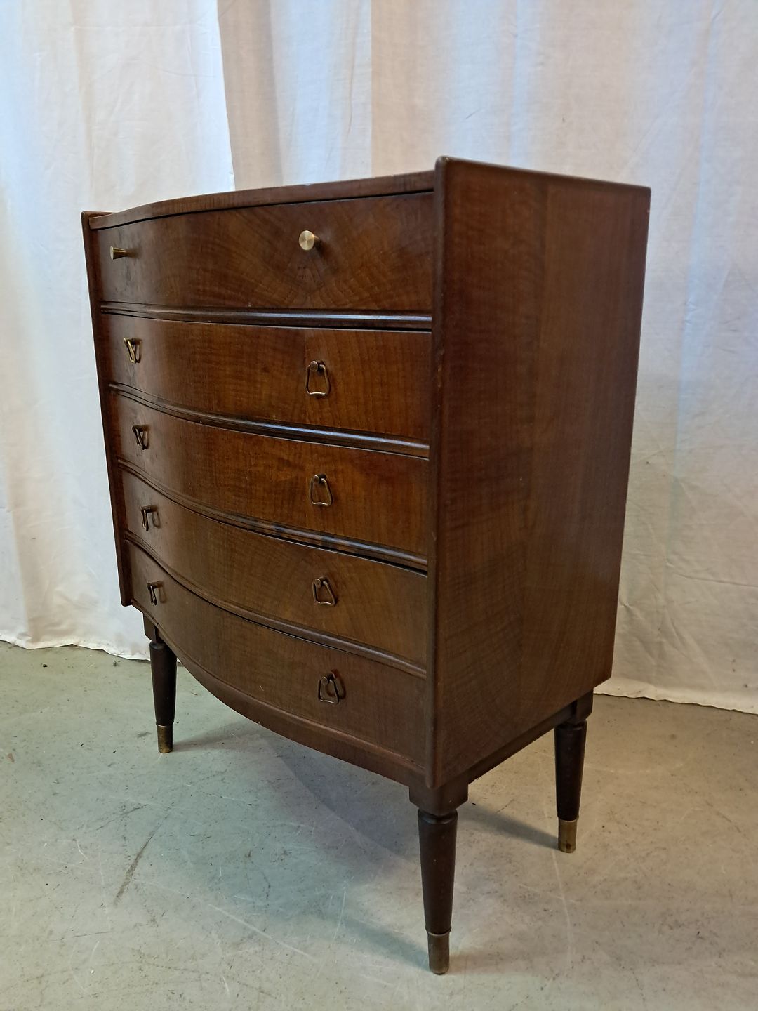 Kommode i fineret nødetræ, fra 1950erne. Den har brugsspor. Højde 71cm Bredde 56cm Dybde 32cm Emne nummer: 77725
