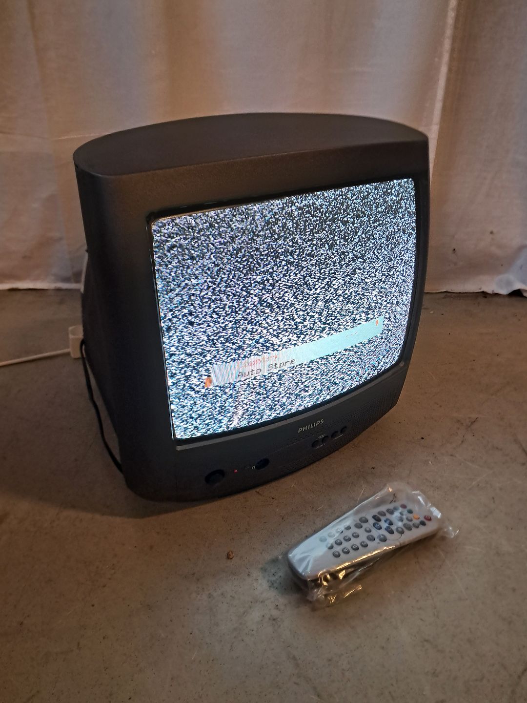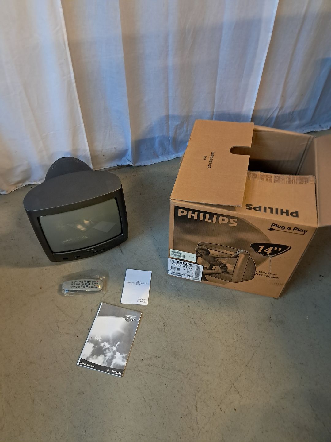 14 Tommer Philips tv fra år 2004 Der medfølger fjernbetjening. Højde 36cm Bredde 36cm Dybde 38cm Emne nummer: 77751
