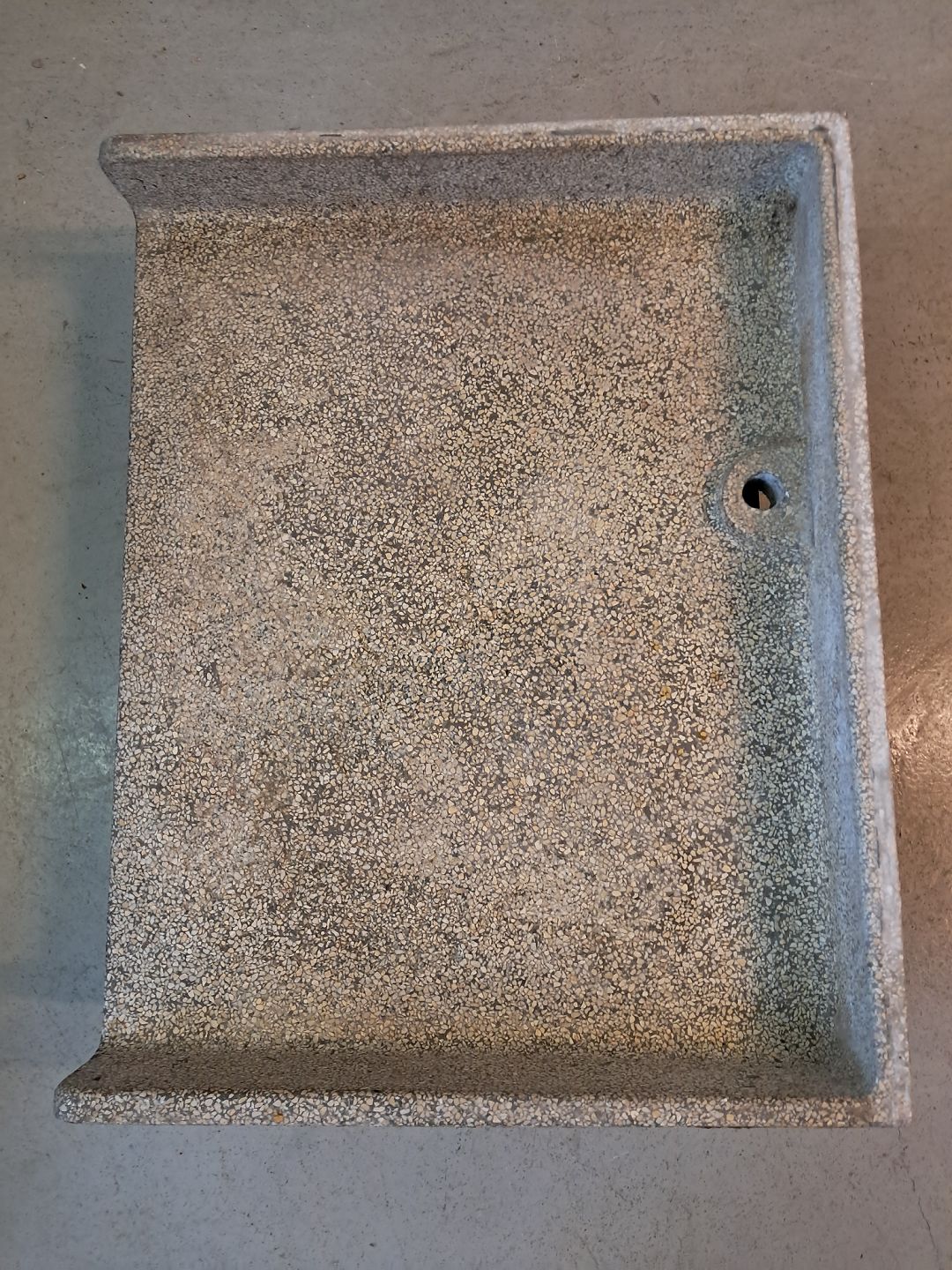 Terrazzo plade fra 1930erne. Den har brugsspor og slid. Højde 14cm Bredde 77cm Dybde 62cm Plade tykkelse 3,2cm Emne nummer: 77762