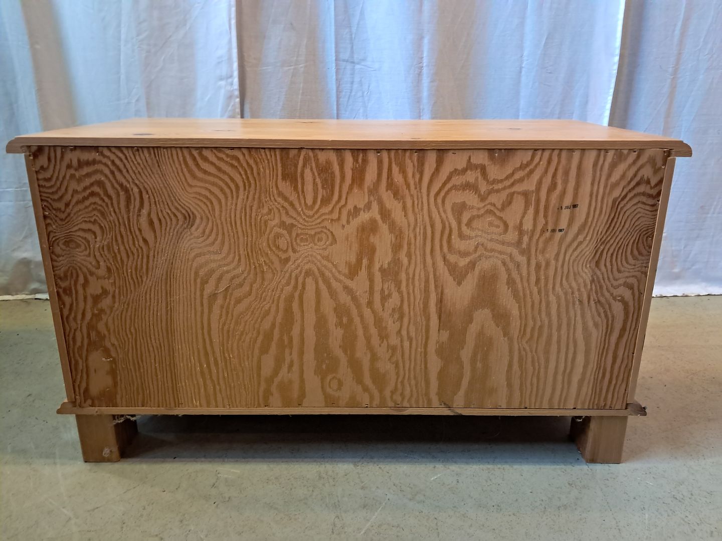 Kommode i massivt fyrretræ, fra 1980erne. Den har brugsspor. Højde 47cm Bredde 84cm Dybde 38cm Emne nummer: 77850
