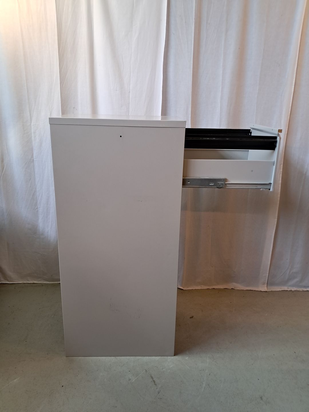 Malet metal kommode/arkivskab, fra 1990erne. Det har brugsspor og der medfølger ikke nøgle. Højde 132cm Bredde 47cm Dybde 62cm Emne nummer: 77915