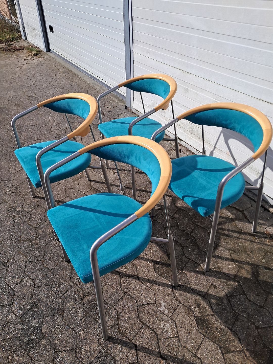 4 Chairman stole af Henrik Tengler i metal med turkis stofbetræk, fra 2000erne. De har brugsspor. Ryghøjde 76cm Sædehøjde 44cm Emne nummer: 77925
