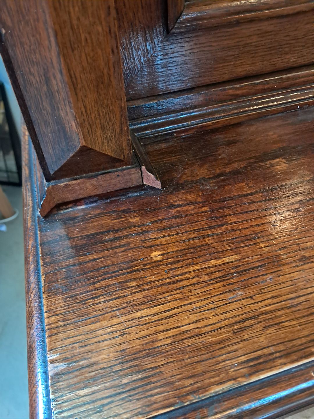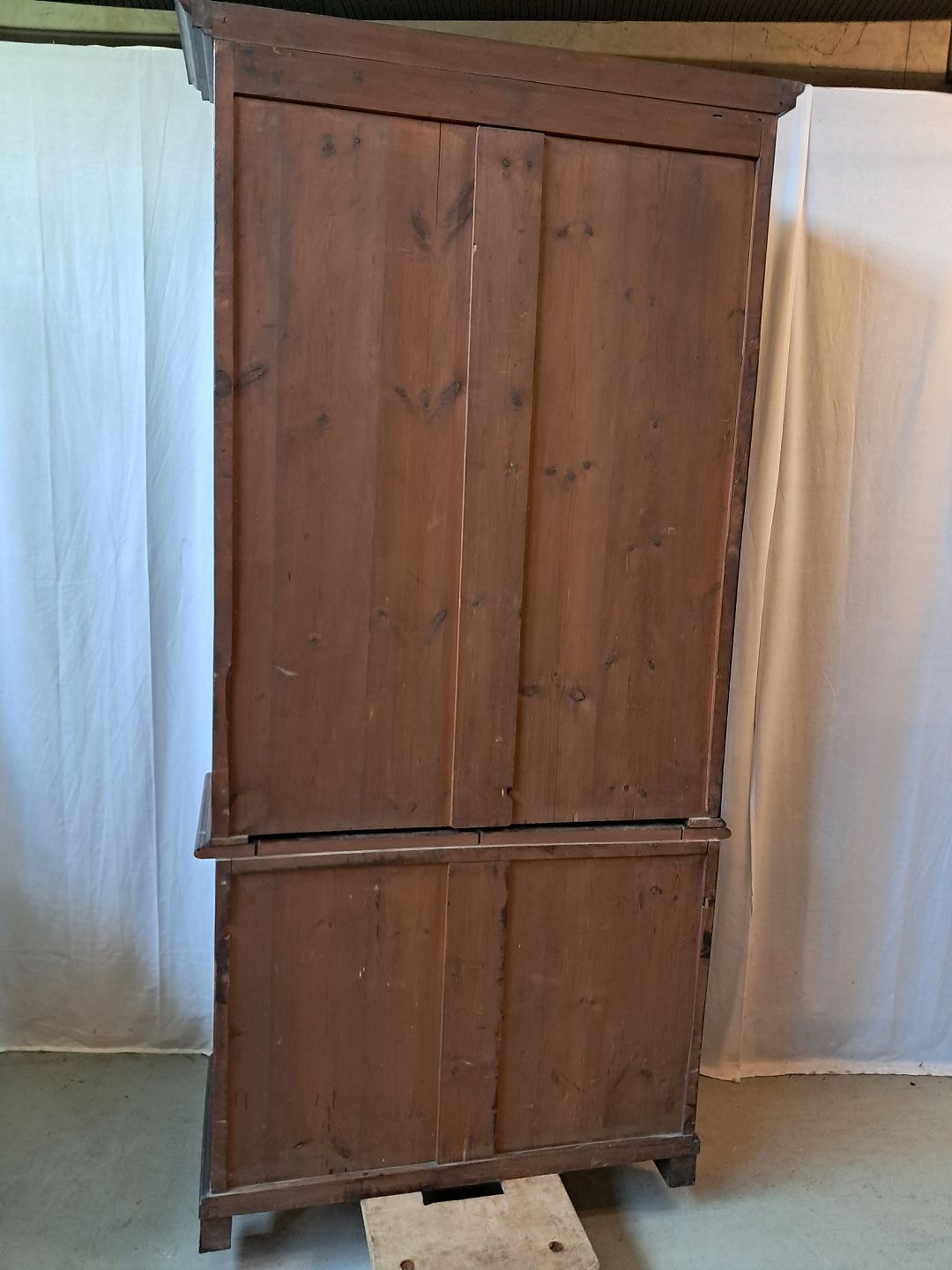 Skab med vitrineoverdel i massivt og fineret egetræ, fra 1900erne. De har brugsspor og mangler et par lister. (se foto) Højde 220cm Bredde 105cm Dybder 48cm og 25cm Emne nummer: 77940