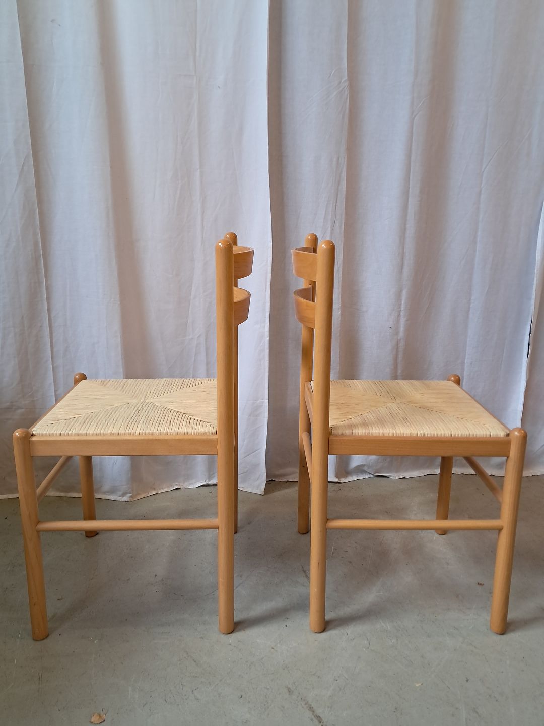 2 Stole i massivt bøgetræ med sæde af sivflet, fra 2000erne. De har brugsspor. Ryghøjde 82cm Sædehøjde 45cm Emne nummer: 77941