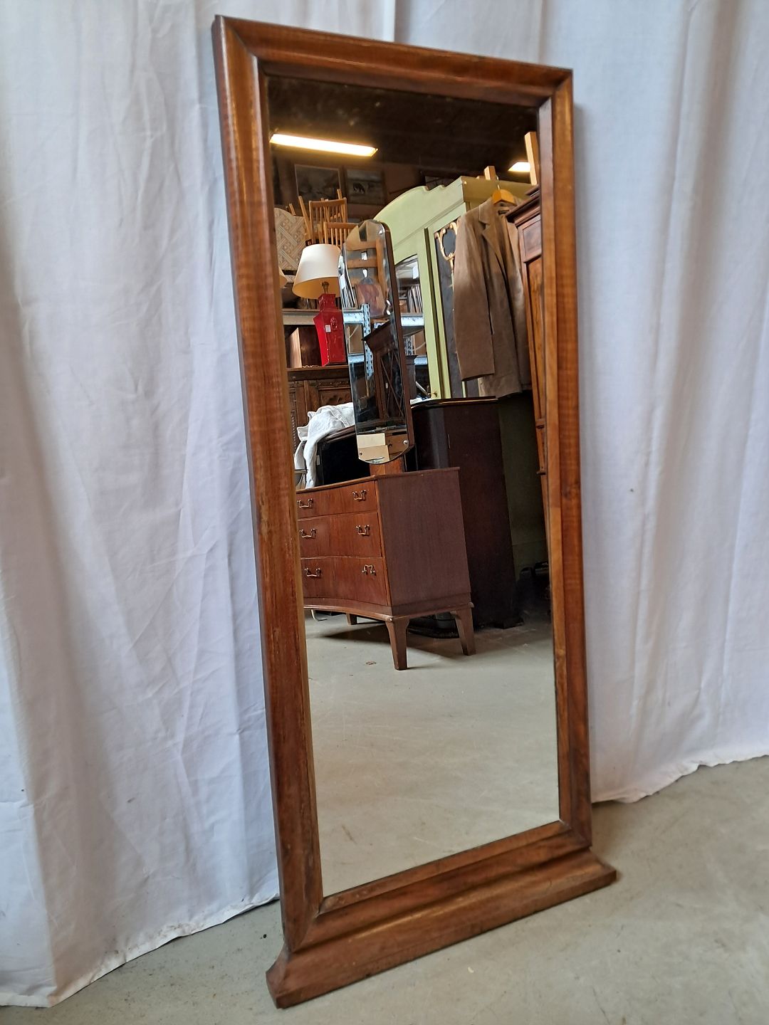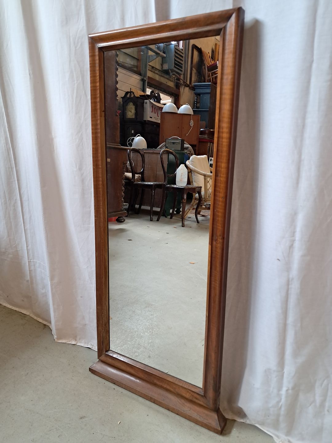 Spejl i fineret mahogni, fra 1900erne. Det har brugsspor. Højde 107cm Bredde 49cm Emne nummer: 77944