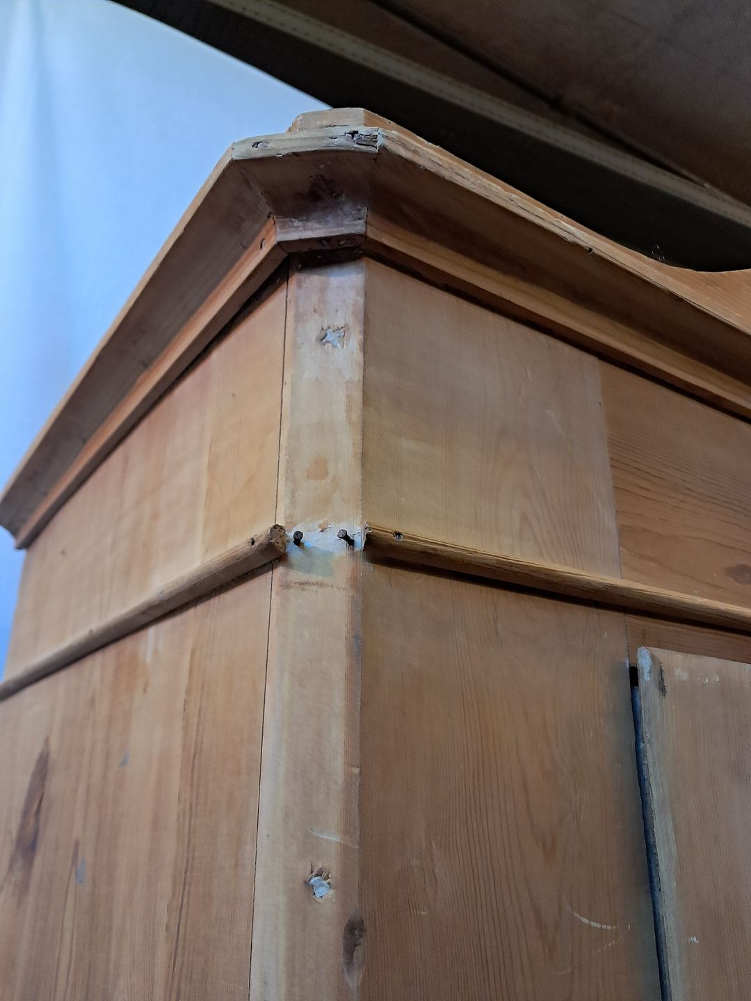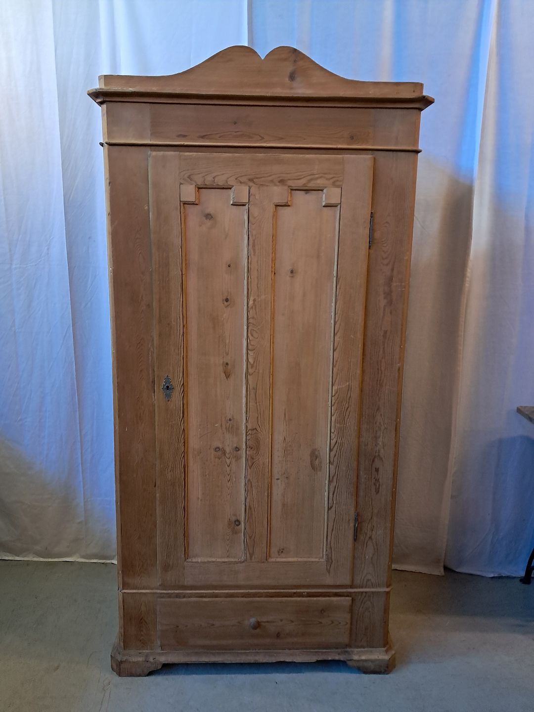 Skab i massivt fyrretræ, fra 1910erne. Det har brugsspor og defekte lister. Højde 183cm Bredde 92cm Dybde 45cm Emne nummer: 77961