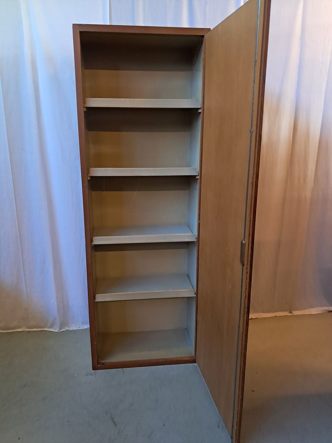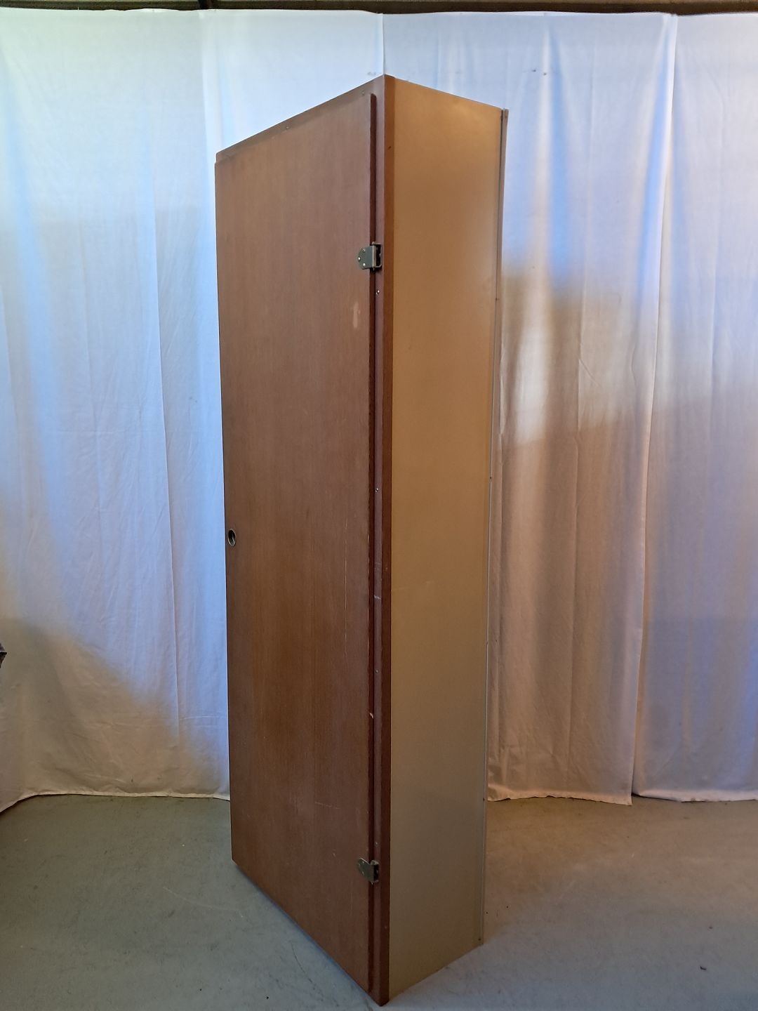 Boligens byggeskab fra 1960'erne med låge i Oregon pinem, designet af Børge Mogensen og Grethe Meyer. Det har brugsspor, og lågen ikke helt i, og der medfølger ikke sokkel. Højde 199cm. Bredde 69cm Dybde 39cm Emne nummer: 77984
