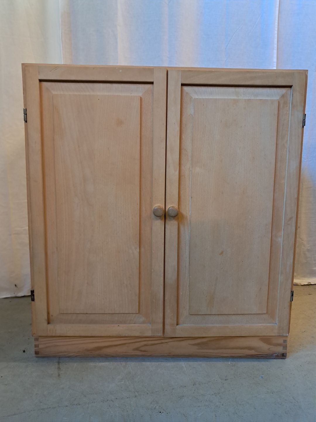 Skab i bøge krydsfiner, fra 2000erne. Det har brugsspor og gaber lidt i venstre hjørne.(se foto) Højde 70cm Bredde 70cm Dybde 30cm Sokkelhøjde 7cm Emne nummer: 77985