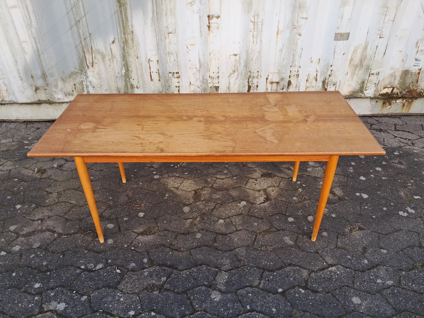 Sofabord i fineret teaktræ med ben i massivt bøgetræ, fra 1960erne. Bordpladen har brugsspor. Højde 52cm Bredde 55cm Længde 130cm Emne nummer: 77990
