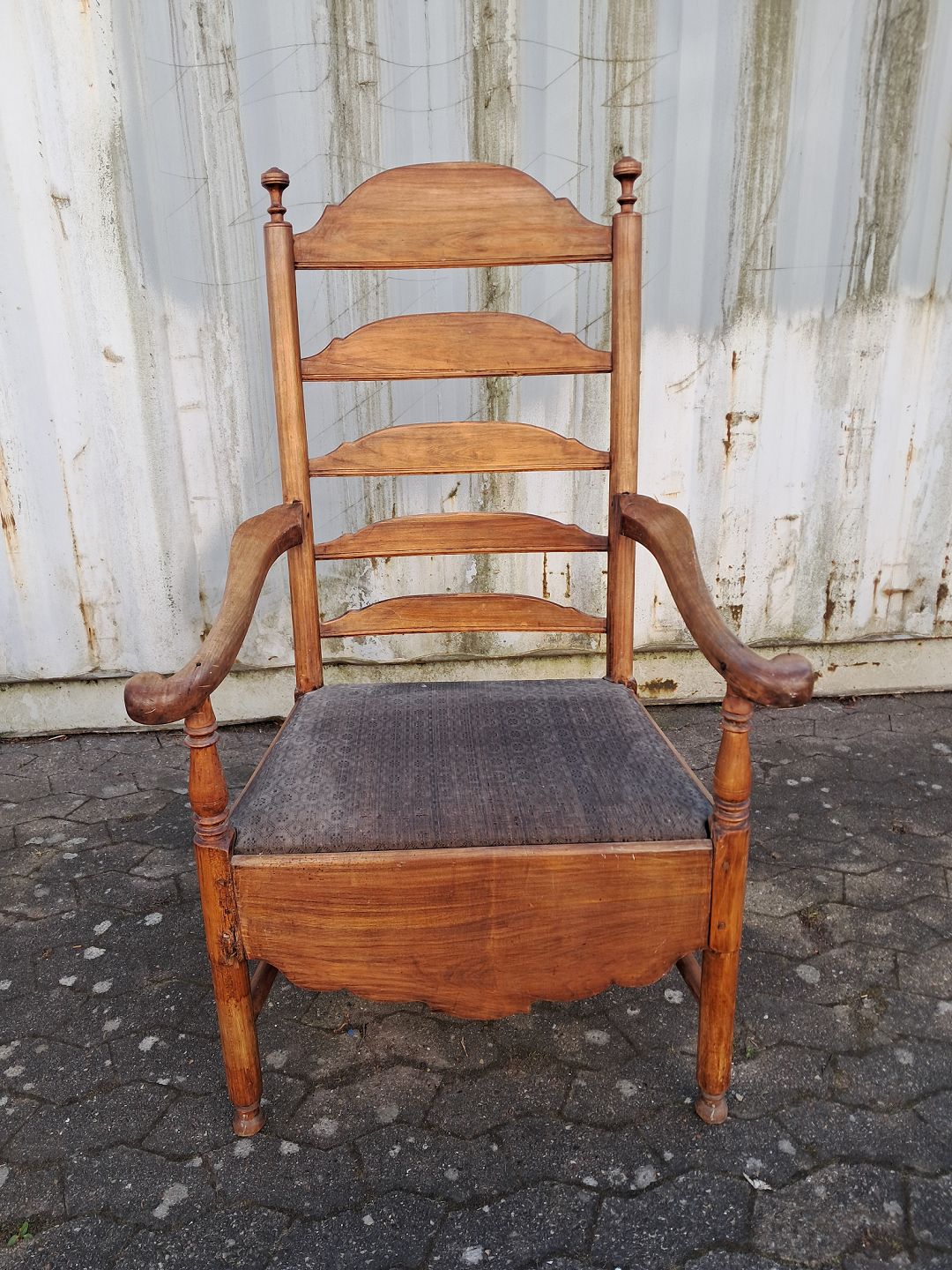 Gammel armstol i massivt træ, fra 1900erne. Den har brugsspor. Ryghøjde 124cm Bredde 75cm Dybde 47cm Sædehøjde 45cm Emne nummer: 77991